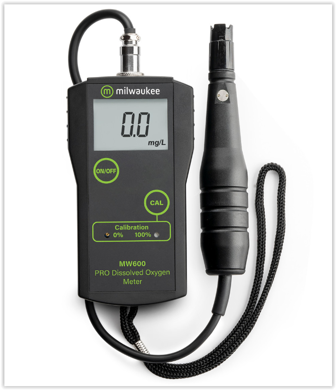 The Milwaukee AQ600 dissolved oxygen (DO) meter kit is a portable dissolved oxygen (DO) MW600 meter for educational, aquaculture, water analysis, and environmental analysis applications, with an LCD screen and polarographic probe with 3m cable and screw-on cap membrane. The meter has two-point manual calibration and automatic temperature compensation from 0 to 30°C. It runs on one 9V alkaline battery (included). The kit comes with a hard shell briefcase-style carrying case with padded interior. DO meters are commonly used in water-quality testing applications.